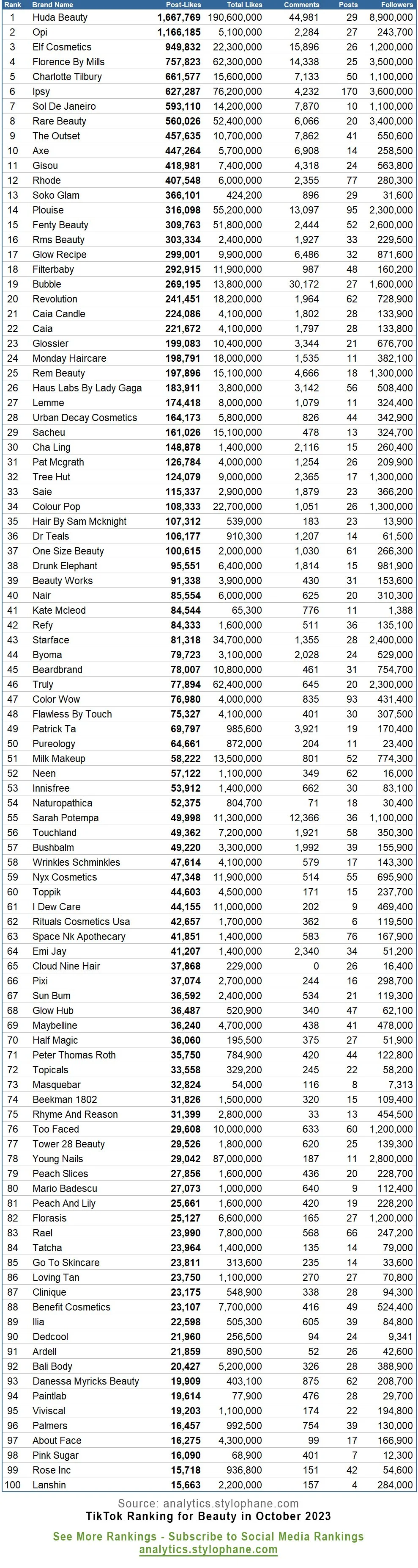 Beauty Top 100 - TikTok Most Engaged Brands - Oct 2023