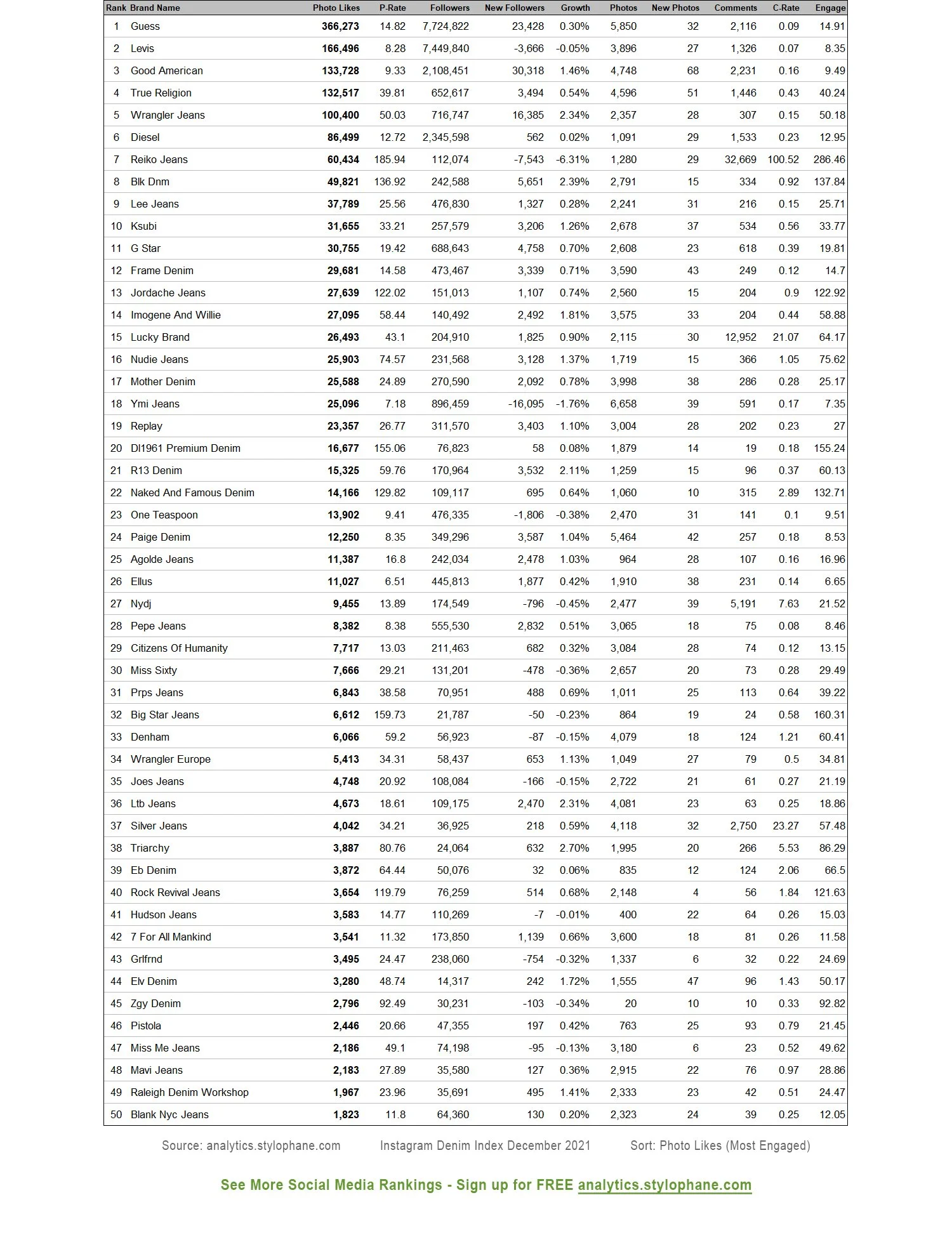 Denim Top 50 - Most Engaged Brands on Instagram - Dec 2021