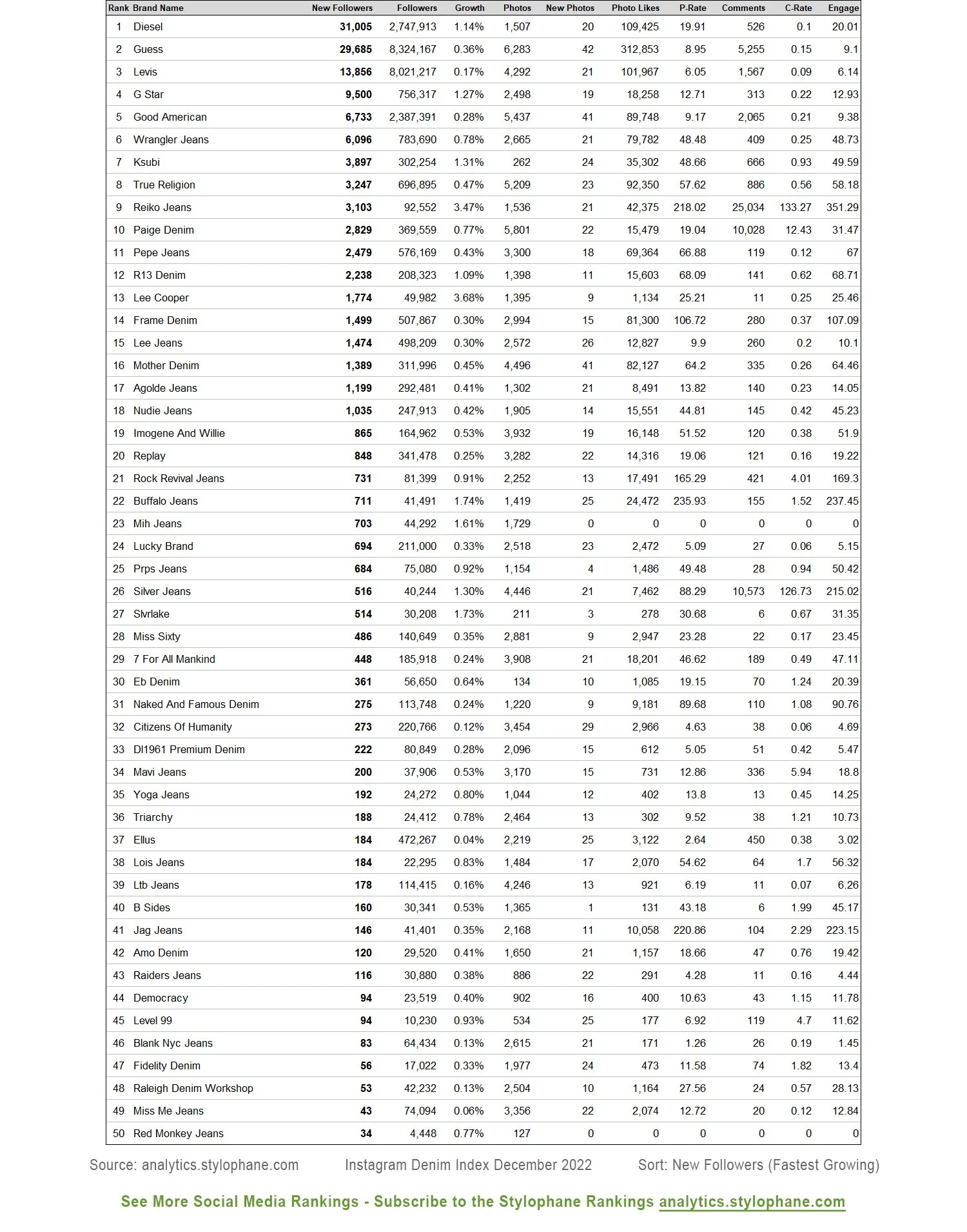 Denim Top 50 - Fastest Growing Brands on Instagram - Dec 2022