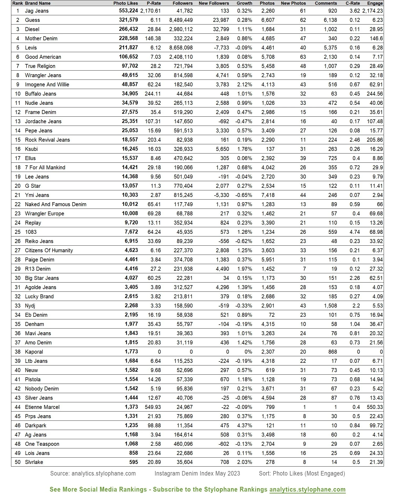 Denim Top 50 - Most Engaged Brands on Instagram - May 2023