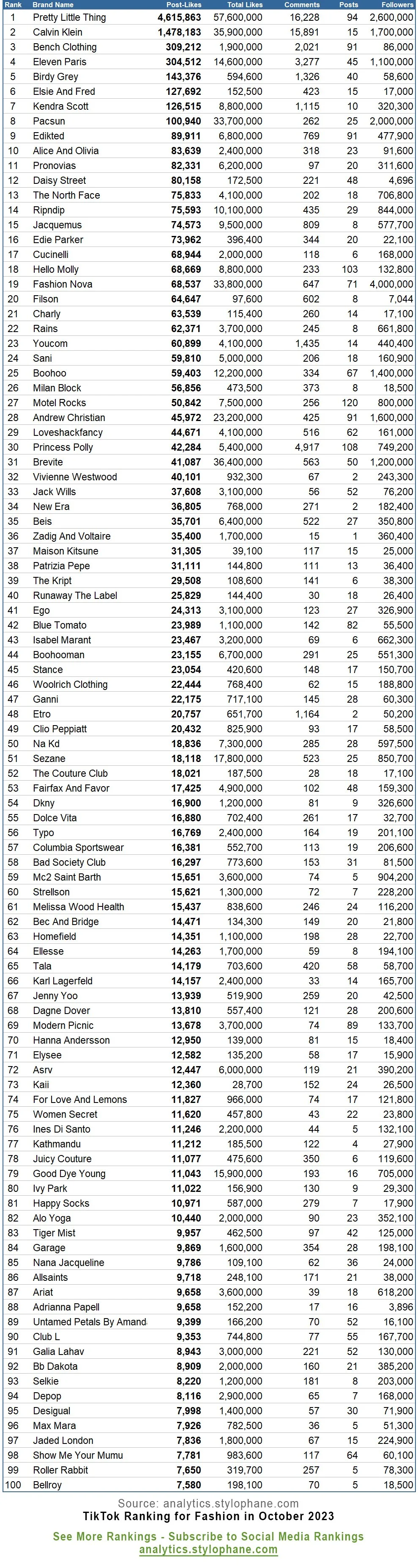 Fashion Top 100 - TikTok Most Engaged Brands - Oct 2023