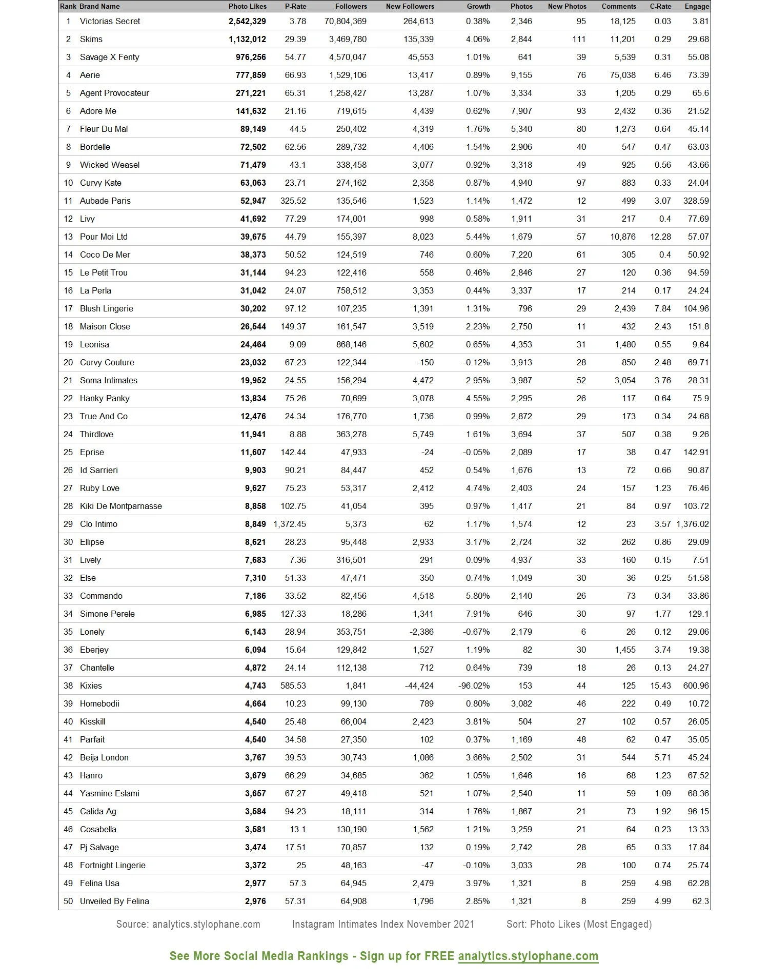 Intimates Top 50 - Fastest Growing Brands on Instagram - March 2022