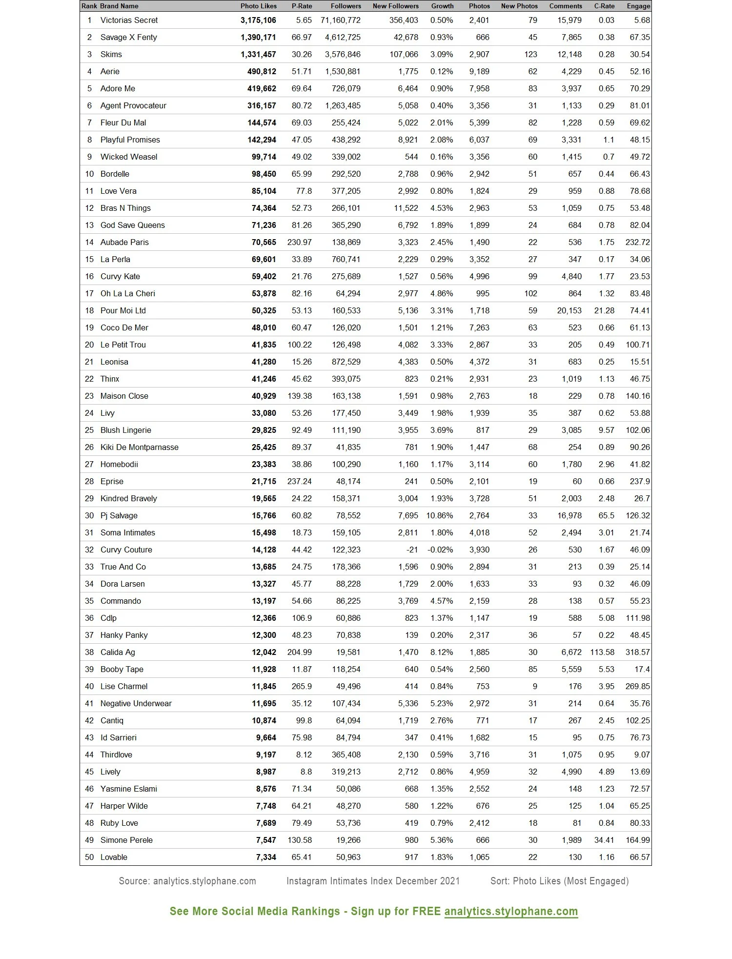 Intimates Top 50 - Most Engaged Brands on Instagram - Dec 2021