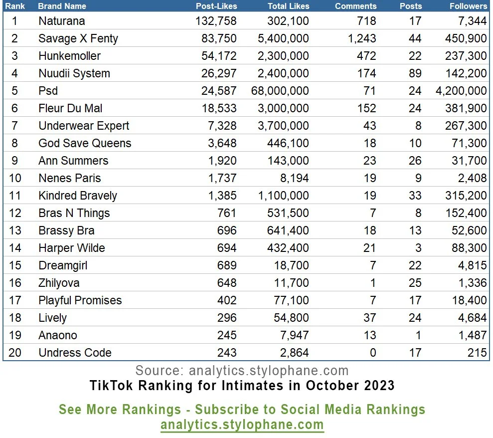 Intimates Top 20 - TikTok Most Engaged Brands - Oct 2023