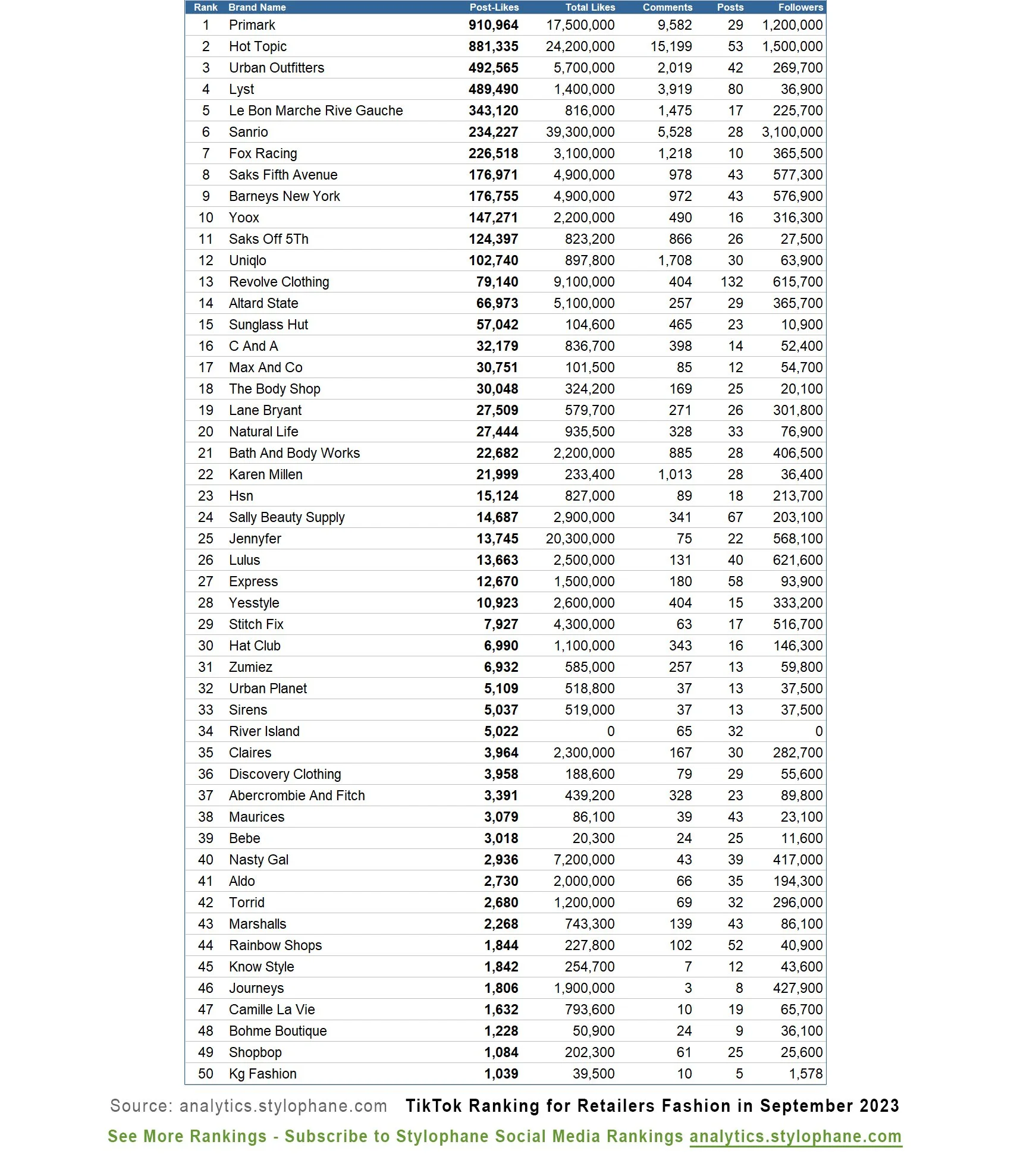 Retailers Top 50 - TikTok Most Engaged Brands - Sept 2023